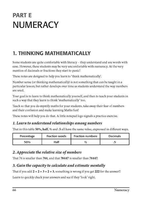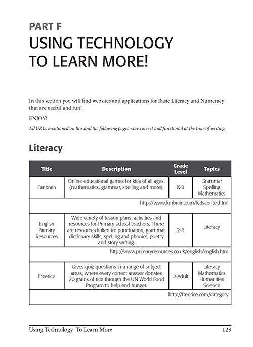The Book Basic literacy and numeracy are integral to education and almost any career in our busy western world. However, some people find that when asked to write or compute they have gaps in their knowledge of which they were quite unaware. These ‘gaps’ might be due to absences from school at times, or even inadequate teaching on some topics!! Grammar (those verbs!), punctuation (the dreaded apostrophes!), spelling (some of the most commonly used and frequently misspelled words), decimals, algebra, percentages, geometry, measurement and fractions (plenty of horrors there!) are all explained simply and clearly. Each has its own practice exercises with answers later on in the book. Throughout, the text has been written in a deliberately informal style to attempt to overcome negative attitudes and demystify these topics, which for some students are unnecessarily worrying. Pre-service primary and secondary teachers have trialled the materials over three years, and many comment that it’s the first maths or grammar textbook that explains the facts simply and hasn’t frightened them! A special section also addresses the wonderful range of applications available through the internet (games, practice sheets, quizzes, video clips, interactive resources, iPad and iPhone apps) from Australia and around the world. The Authors Lorinda Bruce [B.Ed. (Primary), M.Ed. (Info Tech)] is a lecturer in ICT and Maths in the Faculty of Education at Avondale College of Higher Education. Having taught in a range of contexts including primary education, high school and now tertiary, she is currently researching the area of Screen Viewing. Other areas of interest include New Media Creation and Consumption, Web 2.0 Technologies and New Literacies. Gallery